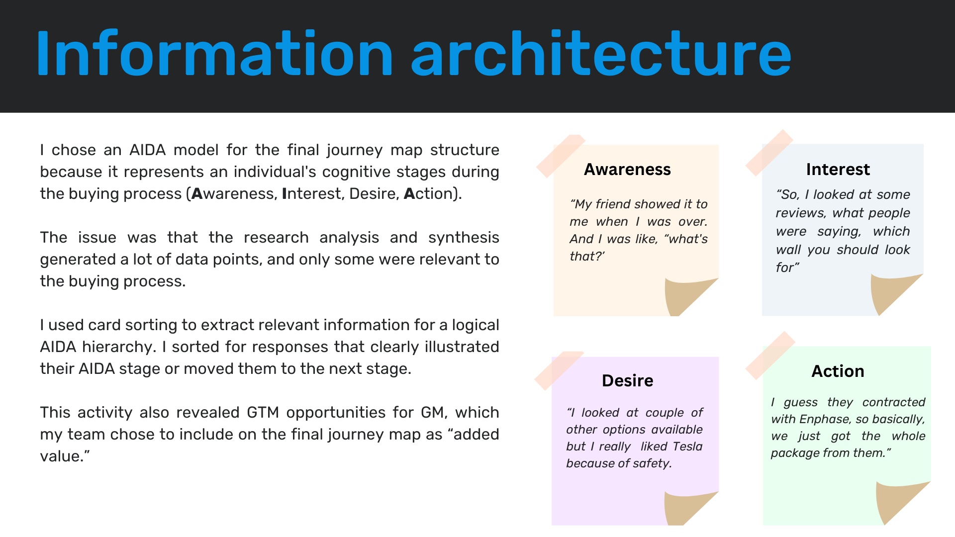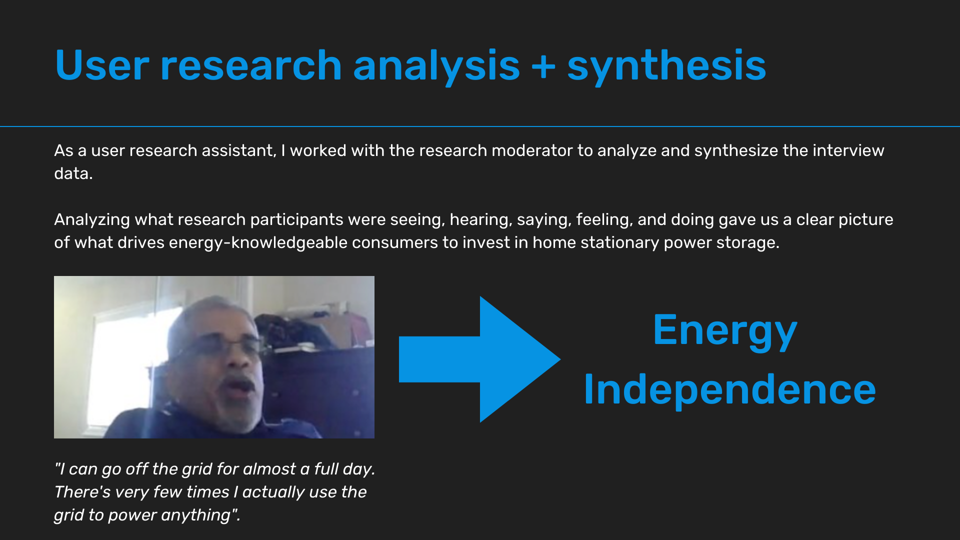 Context: GM wanted to understand the awareness level and path to purchase for home stationary power storage. The findings would be used to formulate a go-to-market strategy and a design strategy to help them get the design right the first time.